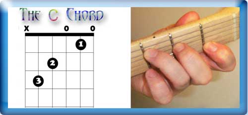 The first chord of the CAGED chords system is the C chord. These chords are simply listed in the order they appear in C-A-G-E-D. You may find that the finger positions are a bit of a stretch at first but the more you practice the C chord, the easier the fingering of the fret board will become.