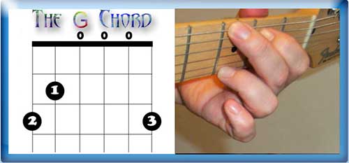 The G chord is one of those chords you can often find alternative finger positions, especially in instructional books and videos. The fingering shown is the most commonly encountered form but as you become accustomed to including your 4th finger or pinky in your playing, you may find yourself replacing finger 3 on the 1st string with your 4th finger; finger 2 on the 6th string, with finger 3 and finger 1 on the 5th string with finger 2. Some people finf that this allows an easier switch between G and C chords, a fairly common and pleasant sounding chord progression. I suggest you try it and see what works for you.